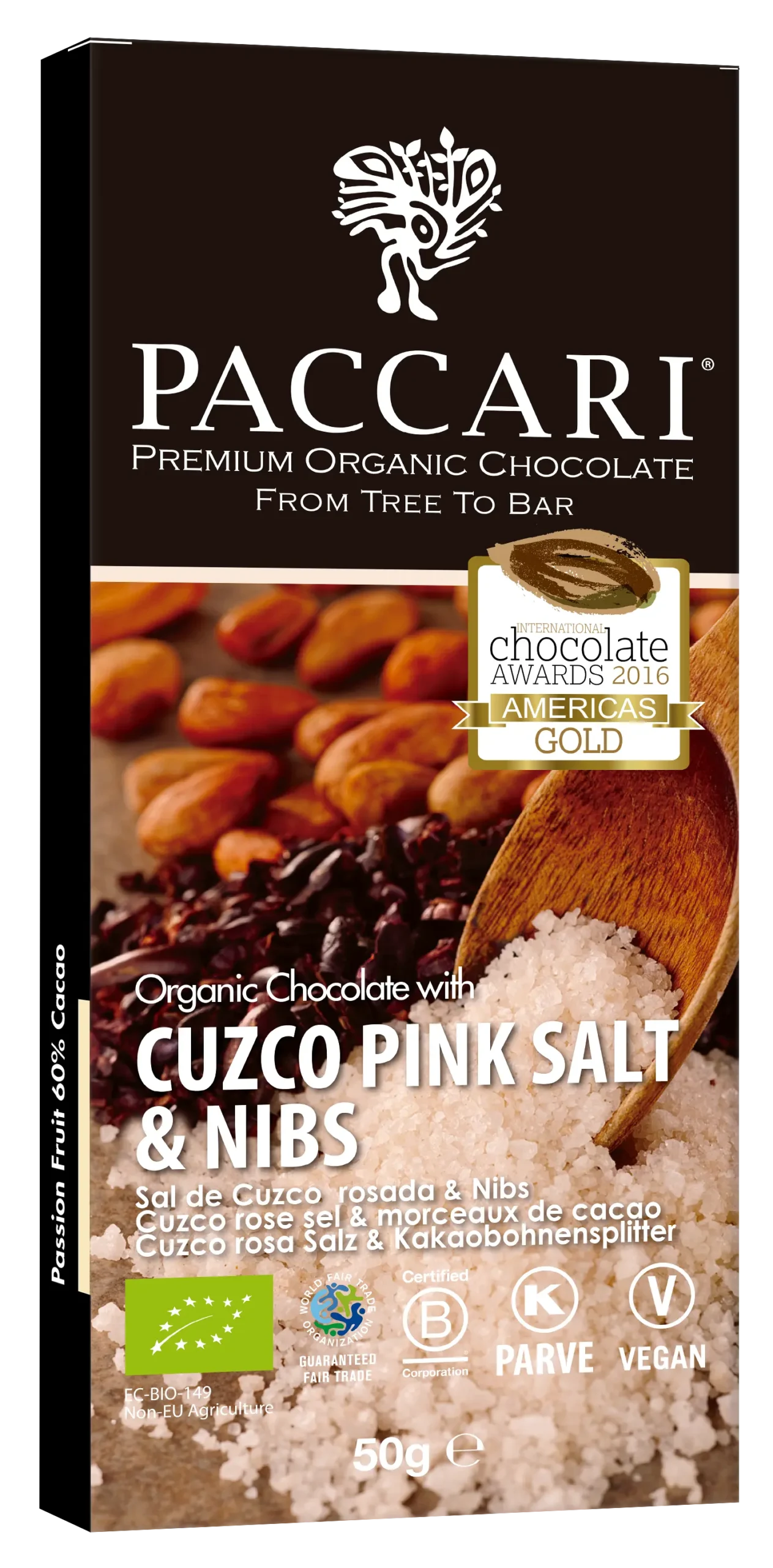 El mejor snack de chocolate: combina el chocolate negro orgánico con un toque de sal mineral de Cuzco y nibs de cacao crujientes. Perfecto contraste de sabores y texturas. Vegano y ganador de Oro en América.
